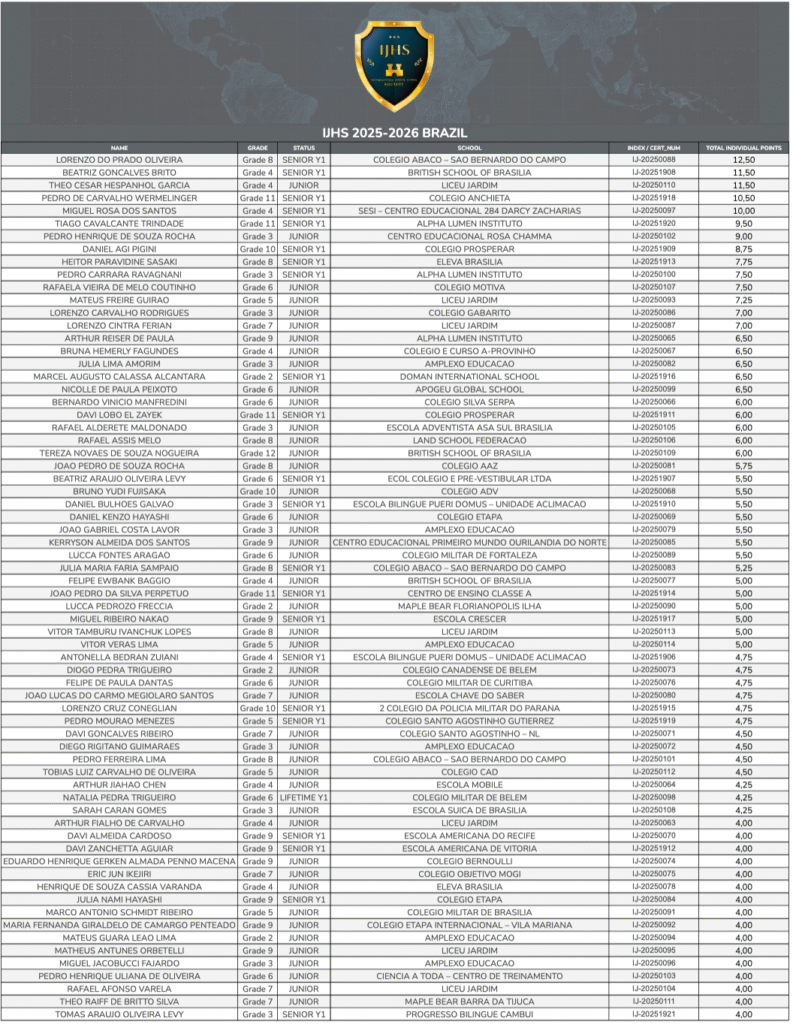 É com grande alegria e orgulho que anunciamos os 42 alunos brasileiros que conquistaram suas vagas na International Junior Honor Society (IJHS)! Esta é uma conquista extraordinária que reflete o compromisso, a dedicação e o esforço de cada um em sua jornada acadêmica e pessoal. Vocês são exemplos de excelência e liderança, e estamos honrados por poder celebrar este momento com vocês.